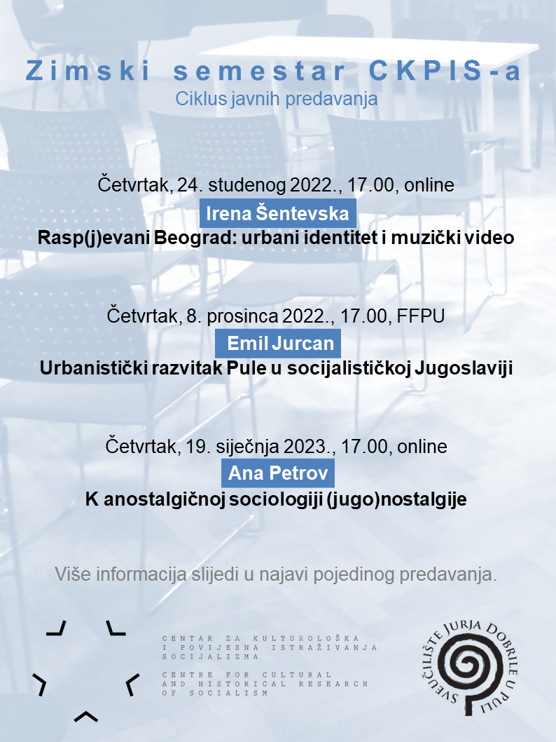Ciklus javnih predavanja Zimski semestar CKPIS-a nastavlja arhitekt i urbanist Emil Jurcan temom Urbanistički razvitak Pule u socijalističkoj Jugoslaviji. Predavanje će se održati u četvrtak, 8. prosinca 2022., u 17.00 sati u Dvorani Slavka Zlatića, u prizemlju Filozofskog fakulteta u Puli, Matetića Ronjgova 1. [VIDEO] [Radio Rojc] [Istra24] [GlasIstrePDF]