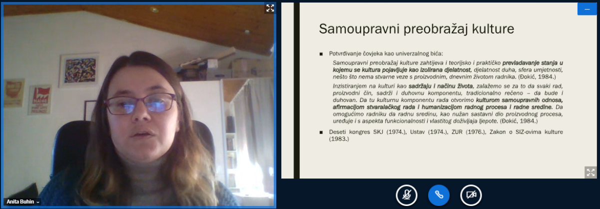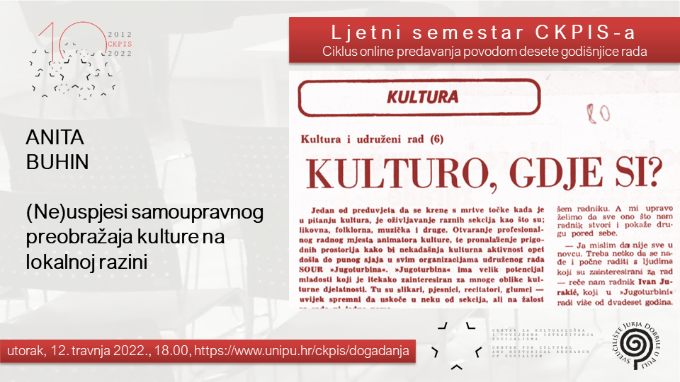 U ciklusu online predavanja Ljetni semestar CKPIS-a, s temom (Ne)uspjesi samoupravnog preobražaja kulture na lokalnoj razini, nastupila je Anita Buhin, naslovna poslijedoktorandica na pulskom sveučilištu i suradnica na projektu Mikrosocijalizam. Predavanje je održano u utorak, 12. travnja 2022., u 18.00 sati u virtualnoj dvorani.
