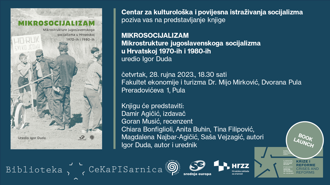 U četvrtak, 28. rujna, u 18.30 sati bit će predstavljen zbornik Mikrosocijalizam. Mikrostrukture jugoslavenskoga socijalizma u Hrvatskoj 1970-ih i 1980-ih koji je uredio Igor Duda. O zborniku će govoriti recenzent Goran Musić (Sveučilište u Beču), Damir Agičić kao izdavač, autori poglavlja Chiara Bonfiglioli, Anita Buhin, Tina Filipović, Magdalena Najbar-Agičić i Saša Vejzagić te Igor Duda kao autor dvaju poglavlja i urednik.