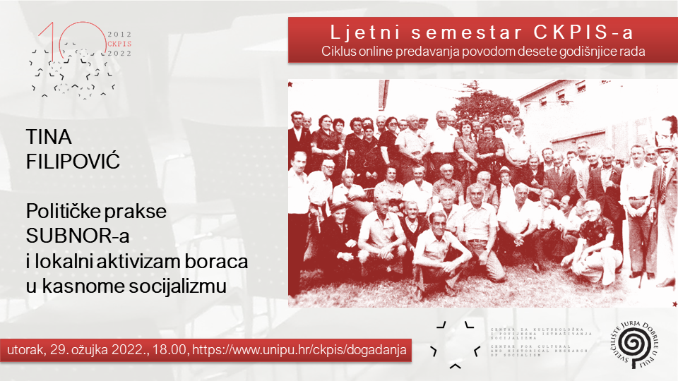 Druga su tema Ljetnog semestra CKPIS-a, ciklusa online predavanja kojim se ove godine obilježava deseta godišnjica rada Centra, bile Političke prakse SUBNOR-a i lokalni aktivizam boraca u kasnome socijalizmu, o čemu je govorila Tina Filipović, doktorandica na projektu Mikrosocijalizam. Predavanje je održano u utorak, 29. ožujka 2022., u 18.00 sati u virtualnoj dvorani.