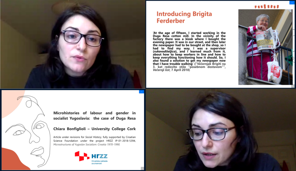 Chiara Bonfiglioli, istraživačica na projektu i predavačica rodnih i ženskih studija na Sveučilišnom koledžu Cork u Irskoj, nastupila je 24. ožujka 2021. u sklopu ciklusa javnih predavanja Ljetni semestar CKPIS-a. Na predavanju pod naslovom Microhistories of labour and gender in socialist Yugoslavia: the case of Duga Resa govorila je o vrijednosti arhivskih izvora za mikrohistoriju rada i roda na primjeru djelovanja Konferencije za društvenu aktivnost žena (KDAŽ) u Dugoj Resi, tamošnjoj industriji i općinskim tijelima od šezdesetih godina nadalje. Duga Resa jedna je od studija slučaja projekta Mikrosocijalizam.