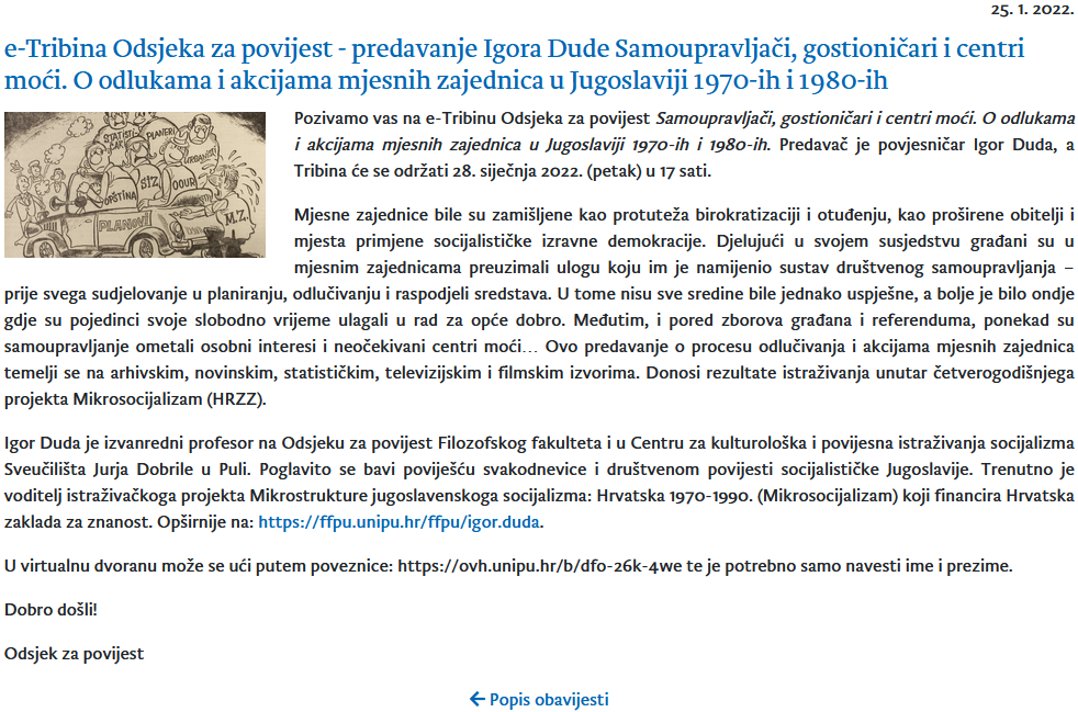 U sklopu e-Tribine, mjesečnog programa javnih predavanja Odsjeka za povijest Filozofskog fakulteta u Puli, 28. siječnja 2022. nastupio je Igor Duda koji je govorio na temu Samoupravljači, gostioničari i centri moći. O odlukama i akcijama mjesnih zajednica u Jugoslaviji 1970-ih i 1980-ih. SAŽETAK – Mjesne zajednice bile su zamišljene kao protuteža birokratizaciji i otuđenju, kao proširene obitelji i mjesta primjene socijalističke izravne demokracije. Djelujući u svojem susjedstvu građani su u mjesnim zajednicama preuzimali ulogu koju im je namijenio sustav društvenog samoupravljanja – prije svega sudjelovanje u planiranju, odlučivanju i raspodjeli sredstava. U tome nisu sve sredine bile jednako uspješne, a bolje je bilo ondje gdje su pojedinci svoje slobodno vrijeme ulagali u rad za opće dobro. Međutim, i pored zborova građana i referenduma, ponekad su samoupravljanje ometali osobni interesi i neočekivani centri moći… Ovo predavanje o procesu odlučivanja i akcijama mjesnih zajednica temelji se na arhivskim, novinskim, statističkim, televizijskim i filmskim izvorima. Donosi rezultate istraživanja unutar četverogodišnjega projekta Mikrosocijalizam (HRZZ). Predavanje je bilo povod za intervju objavljen u Glasu Istre.