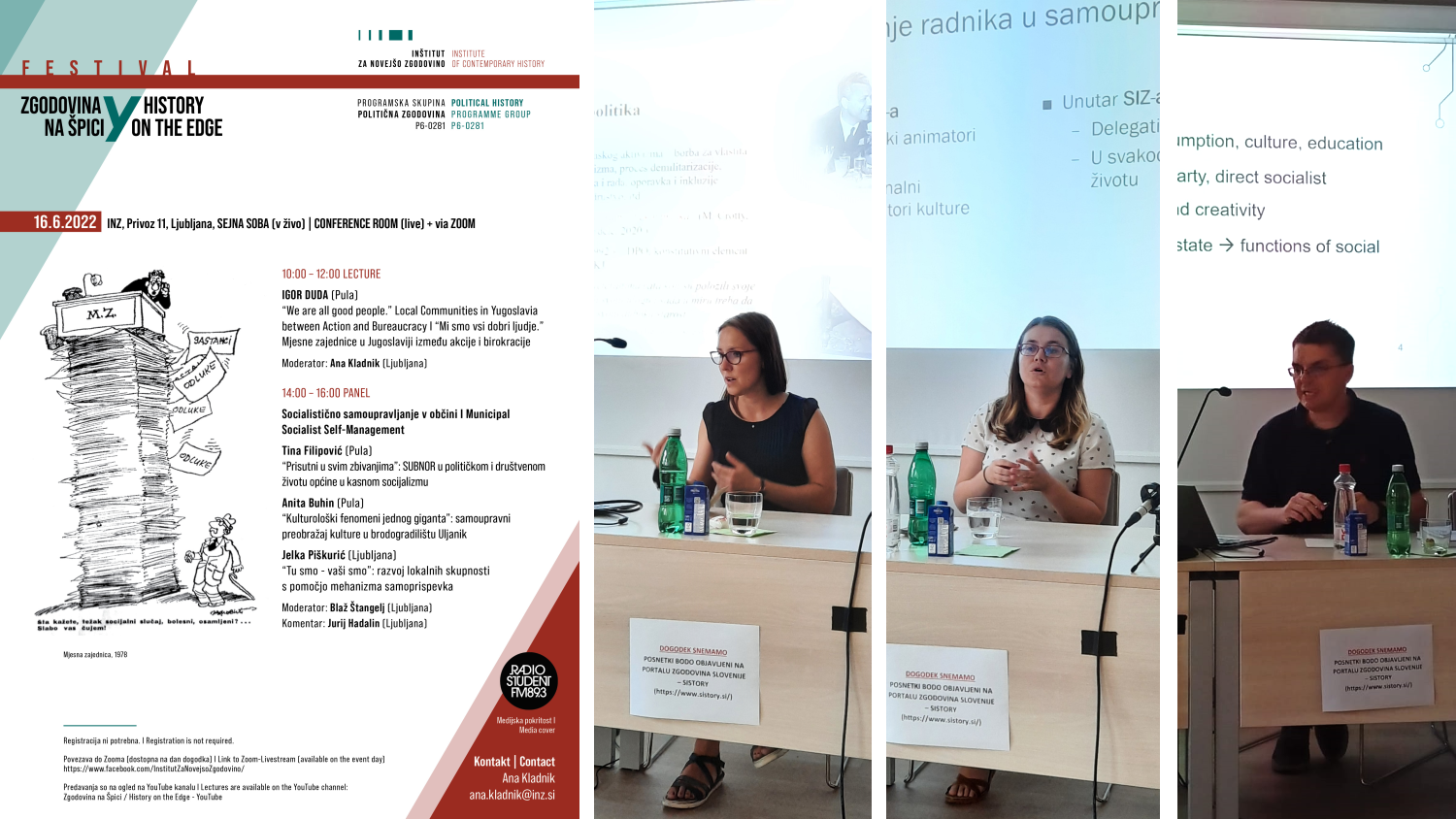 Istraživači na projektu Mikrosocijalizam nastupili su 16. lipnja 2022. na Inštitutu za novejšo zgodovino u Ljubljani, u programu Zgodovina na Špici. Voditelj projekta Igor Duda održao je pozvano predavanje pod naslovom "We are all good people." Local Communities in Yugoslavia between Action and Bureaucracy [video], dok su na panelu Socialistično samoupravljanje v občini sa svojim izlaganjima nastupile Tina Filipović ("Prisutni u svim zbivanjima": SUBNOR u političkom i društvenom životu općine u kasnom socijalizmu, video) i Anita Buhin ("Kulturološki fenomeni jednog giganta": samoupravni preobražaj kulture u brodogradilištu Uljanik, video). Na panelu su sudjelovali i Jelka Piškurić te diskutant Jurij Hadalin i moderator Blaž Štangelj. Moderatorica predavanja bila je Ana Kladnik na čiji je poziv i ostvareno gostovanje u Ljubljani.