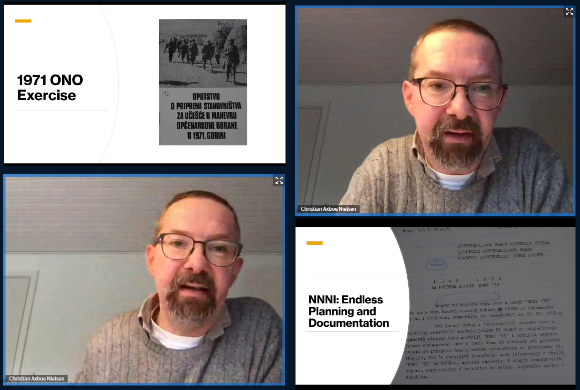 Christian Axboe Nielsen, istraživač na projektu i izvanredni profesor na Sveučilištu u Aarhusu u Danskoj, nastupio je 5. svibnja 2021. u sklopu ciklusa javnih predavanja Ljetni semestar CKPIS-a. Na predavanju pod naslovom The Security Exercises “Nothing should surprise us” – a view from the municipal level in Osijek and surrounding municipalities govorio je o sustavu općenarodne obrane i društvene samozaštite (ONO I DSZ) i akcijama Ništa nas ne smije iznenaditi (NNNI) te o primjeni toga modela civilne zaštite u Osijeku i okolici 1970-ih i 1980-ih. Osijek je jedna od studija slučaja projekta Mikrosocijalizam.
