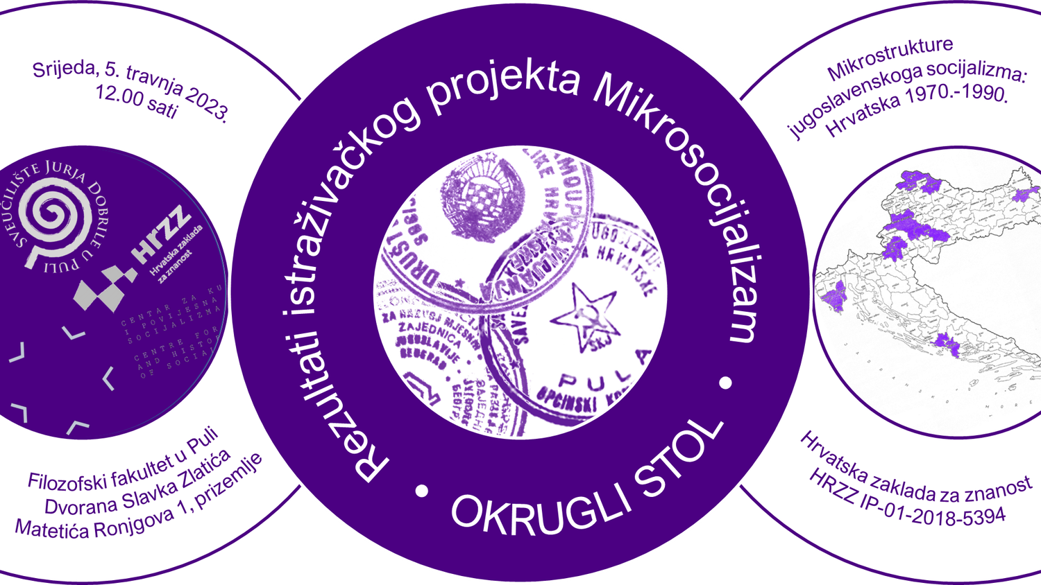 Istraživački projekt Mikrostrukture jugoslavenskoga socijalizma: Hrvatska 1970-1990. (Mikrosocijalizam, HRZZ IP-01-2018-5394) primiče se svome kraju. Suradnici se okupljaju na zadnjem radnom sastanku poslije kojega će u srijedu, 5. travnja 2023., u 12.00 sati u Dvorani Slavka Zlatića, u prizemlju Filozofskoga fakulteta u Puli, za javnost održati okrugli stol na kojem će govoriti o tijeku istraživanja, polazištima i konačnim rezultatima. (Snimka okruglog stola dostupna je na Youtube kanalu CKPIS-a.)