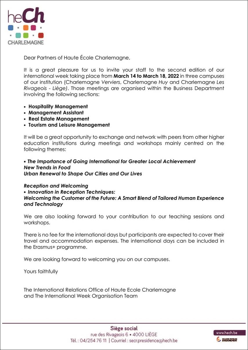 Drugo izdanje international week-a održat će se od 14. ožujka do 18. ožujka, 2022. godine. Događaje je organiziran na tri kampusa institucije Haute Ecole Charlemagne. Sastanci su organizirani za područje ugostiteljstva, pomoćnog menadžmenta, upravljanje nekretninama te turistički menadžment.