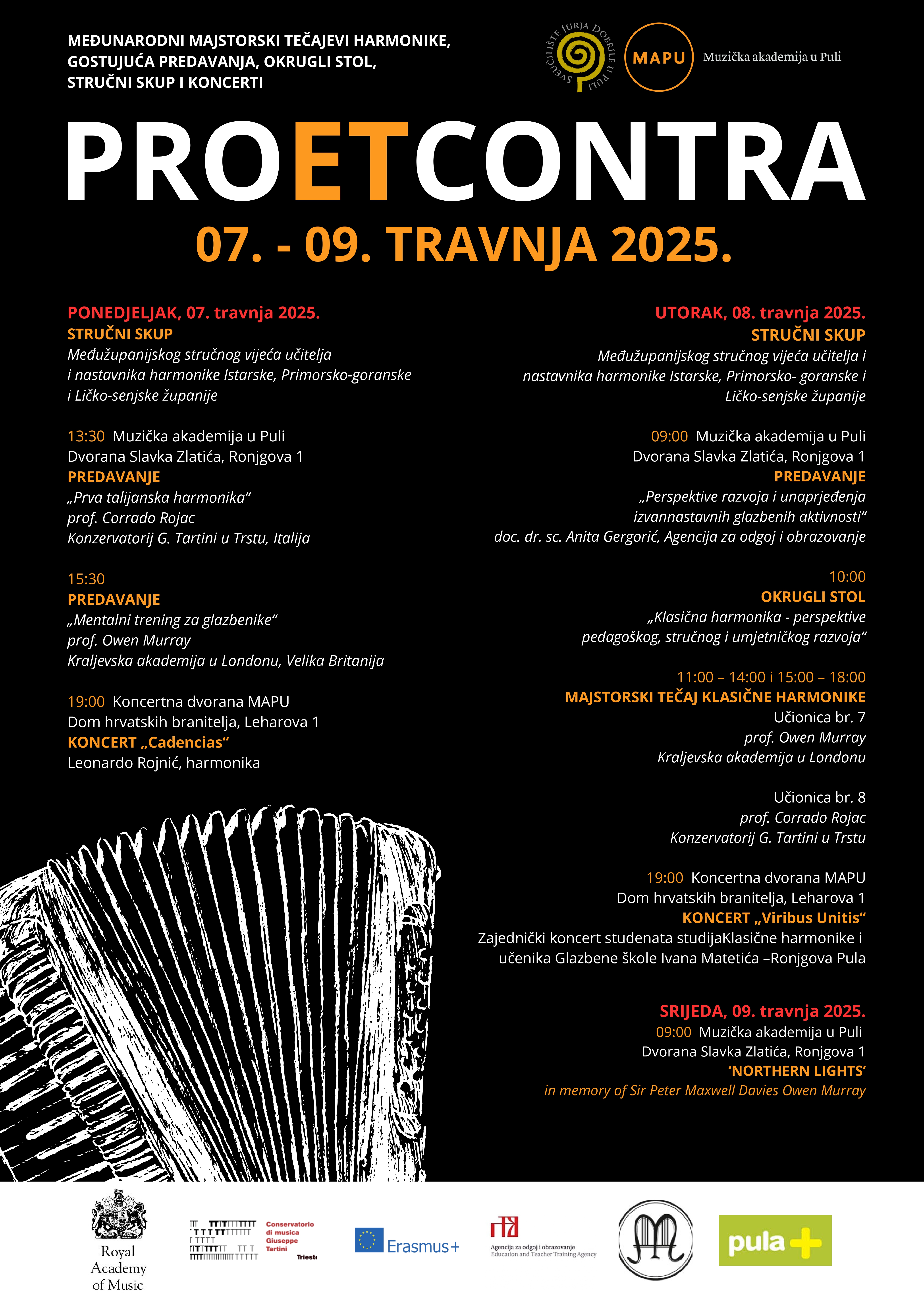 Manifestacija PRO ET CONTRA u organizaciji studija Klasične harmonike pri Muzičkoj akademiji u Puli održat će se od 7. do 9. travnja 2025. godine.