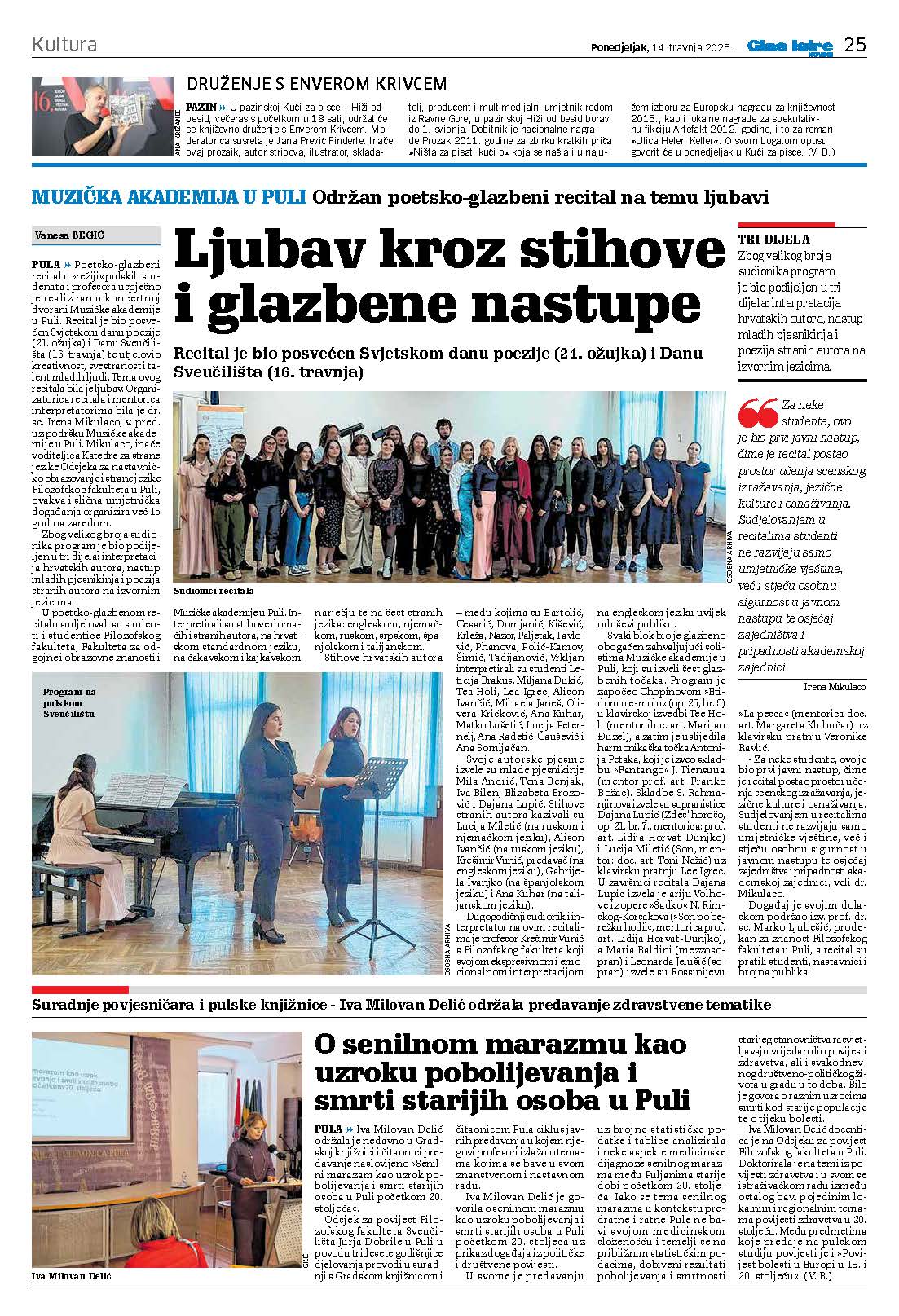 Poetsko-glazbeni recital održao se u petak, 11. travnja u prostoru Muzičke akademije u Puli, a u organizaciji dr. sc. Irene Mikulaco (FFPU).