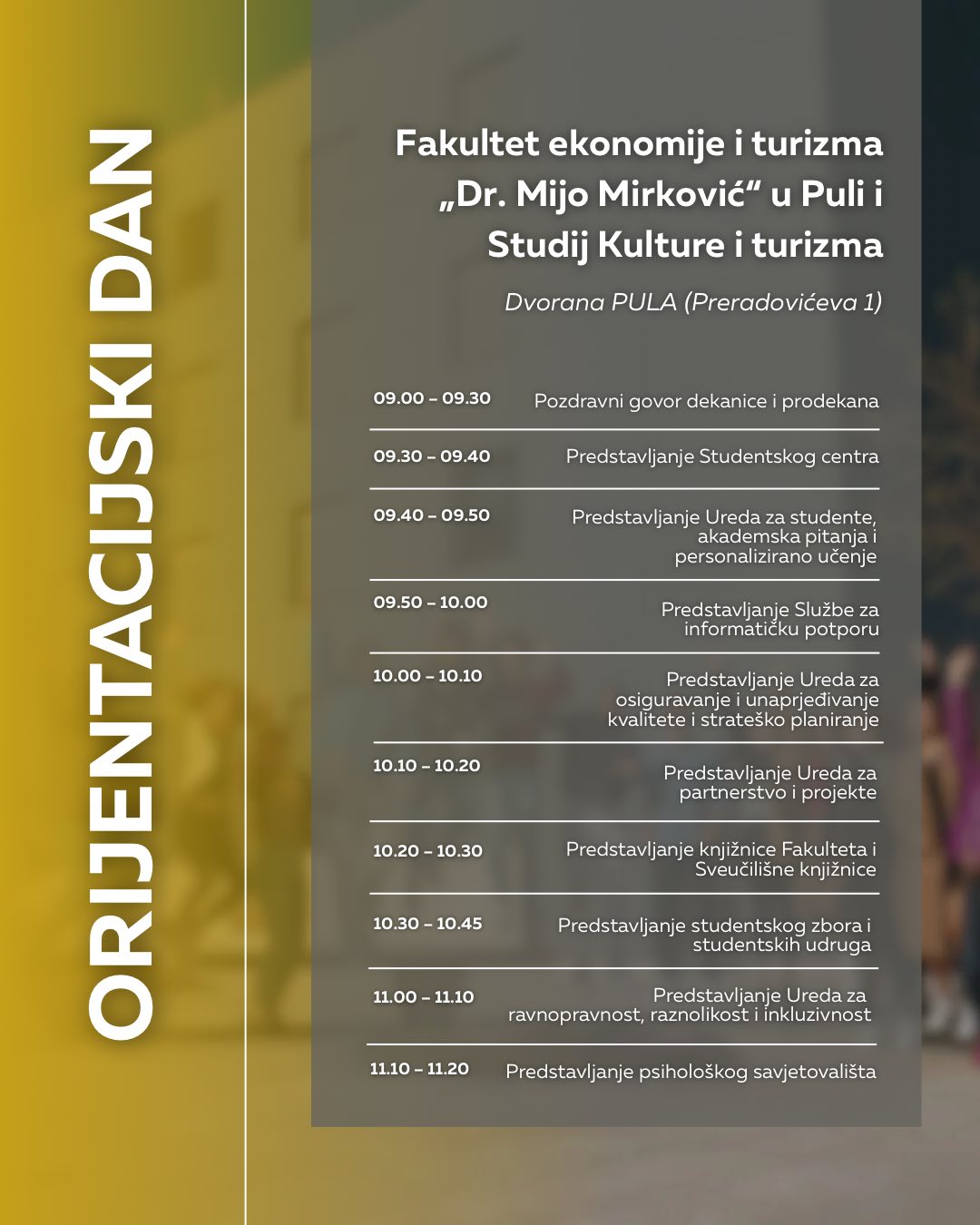 U nastavku donosimo raspored aktivnosti Orijentacijskog dana svih sastavnica – vaš prvi studentski dan ispunjen vrlo korisnim informacijama o studiranju u Puli. Sve se informacije mogu pronaći i na pojedinim stranicama fakulteta i na društvenim mrežama Sveučilišta.