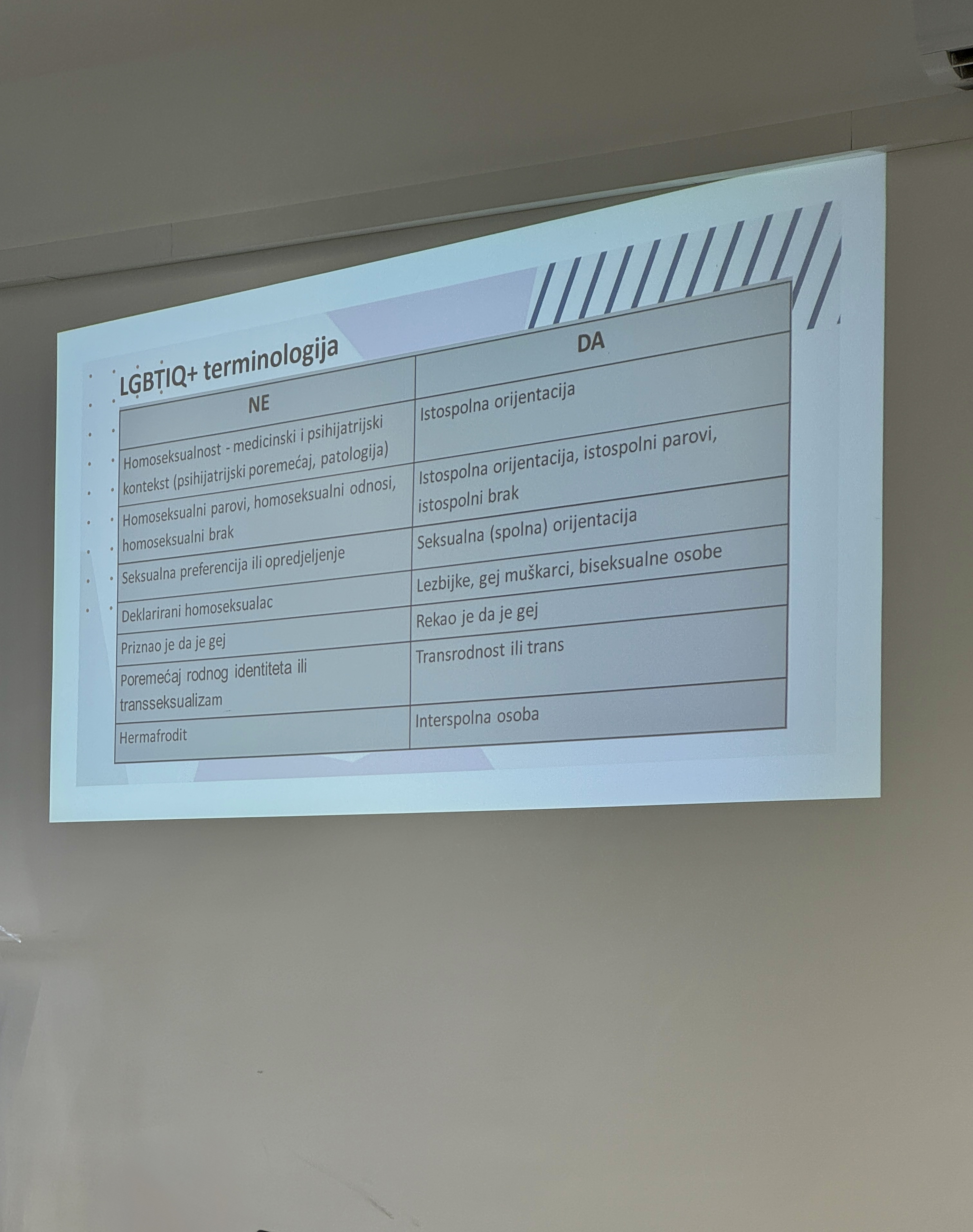 Edukacija je obuhvatila teme vezane uz LGBTIQ terminologiju i rodno uključiv jezik, uz poseban naglasak na prepoznavanje LGBTIQ-fobije te stvaranje inkluzivnog obrazovnog okruženja. Održana je u dva termina – jedan namijenjen studenticama i studentima, a drugi nastavnom osoblju.