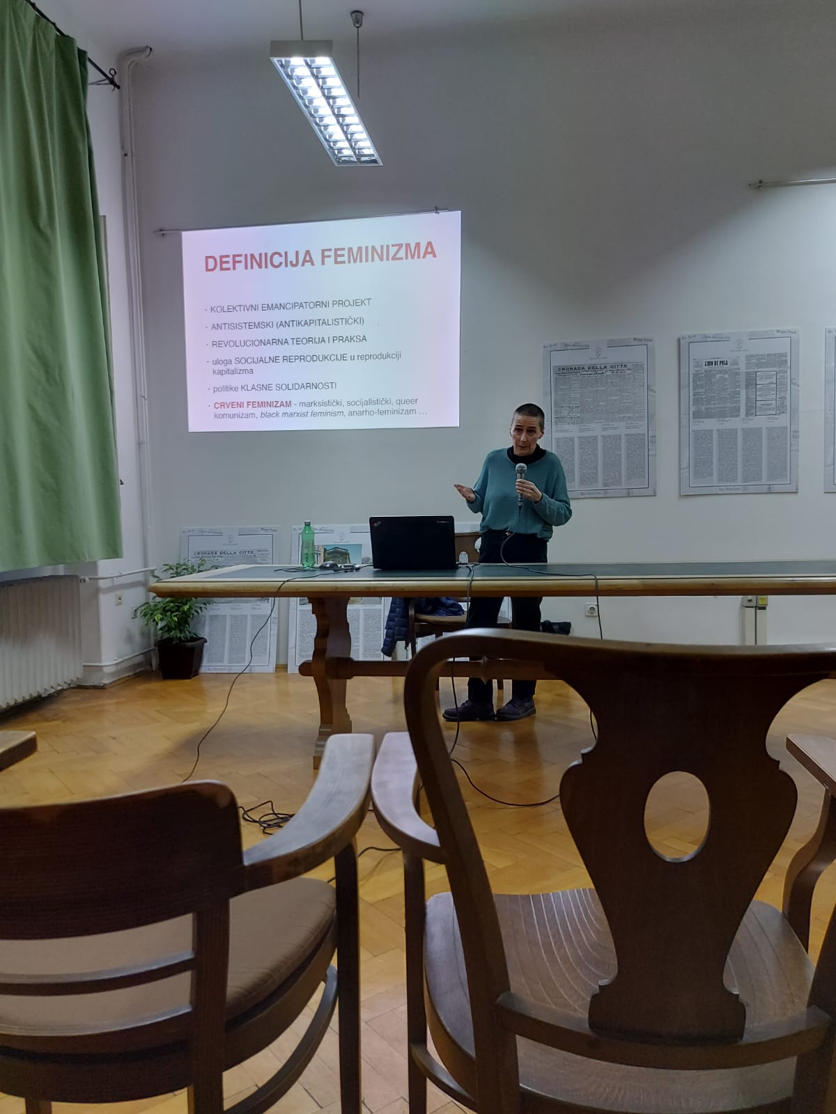 O predavačici: Andreja Gregorina diplomirala je filozofiju i komparativnu književnost na Filozofskom fakultetu Sveučilišta u Zagrebu. Dugogodišnja je ekološka aktivistkinja i feministkinja, predavačica na neformalnih obrazovnim programima iz područja ženskih radničkih prava i historije feminističkog pokreta, suradnica kustoskog kolektiva BLOK, voditeljica marksističko-feminističkog kružoka FEMATIK te autorica članaka u neprofitnim medijima.
