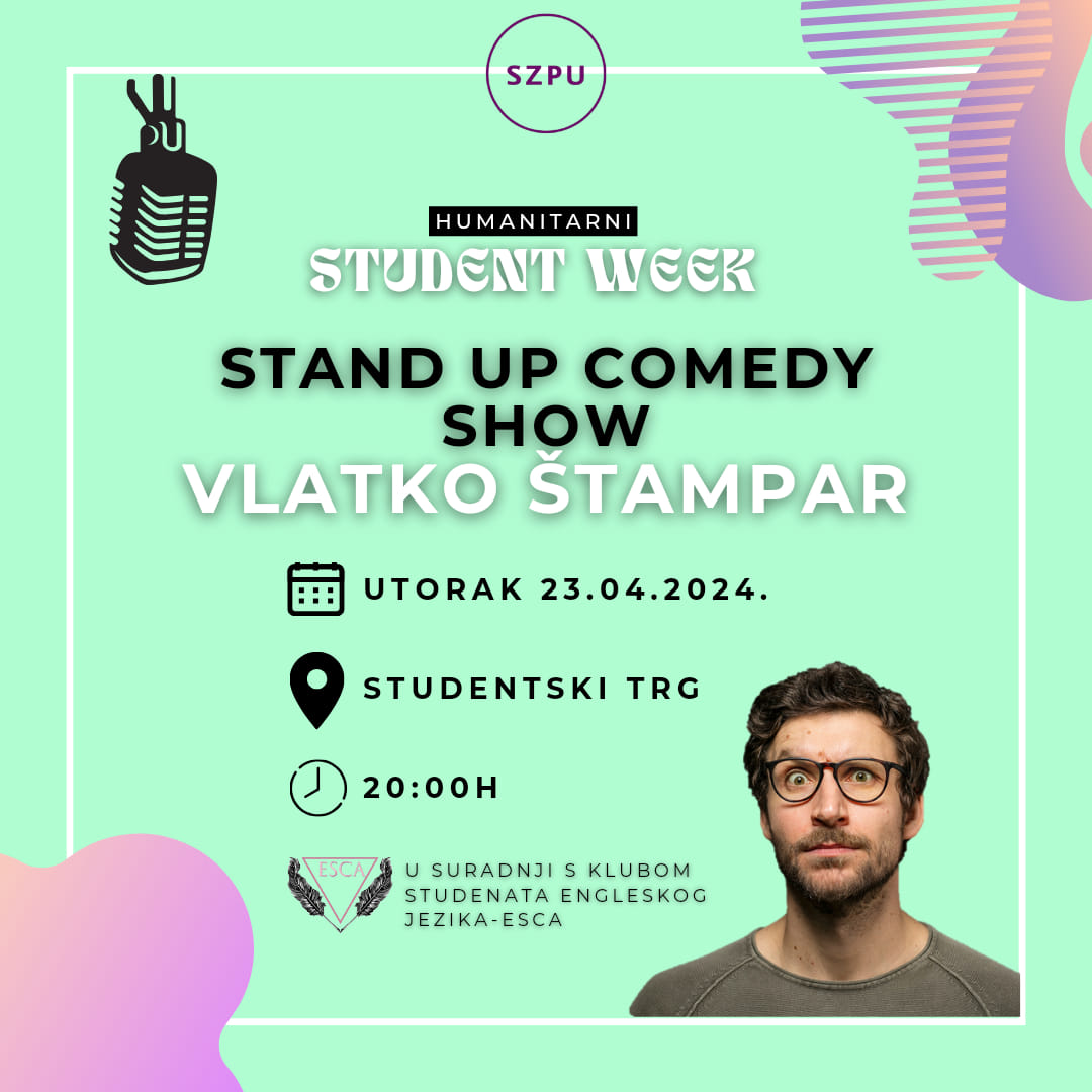 pozivamo Vas na Stand up comedy show Vlatka Štampara u organizaciji Studentskog zbora u Puli i Kluba studenata engleskog jezika - ESCA koji će se održati u utorak 23. travnja 2024. u 20:00h na Studentskom trgu.