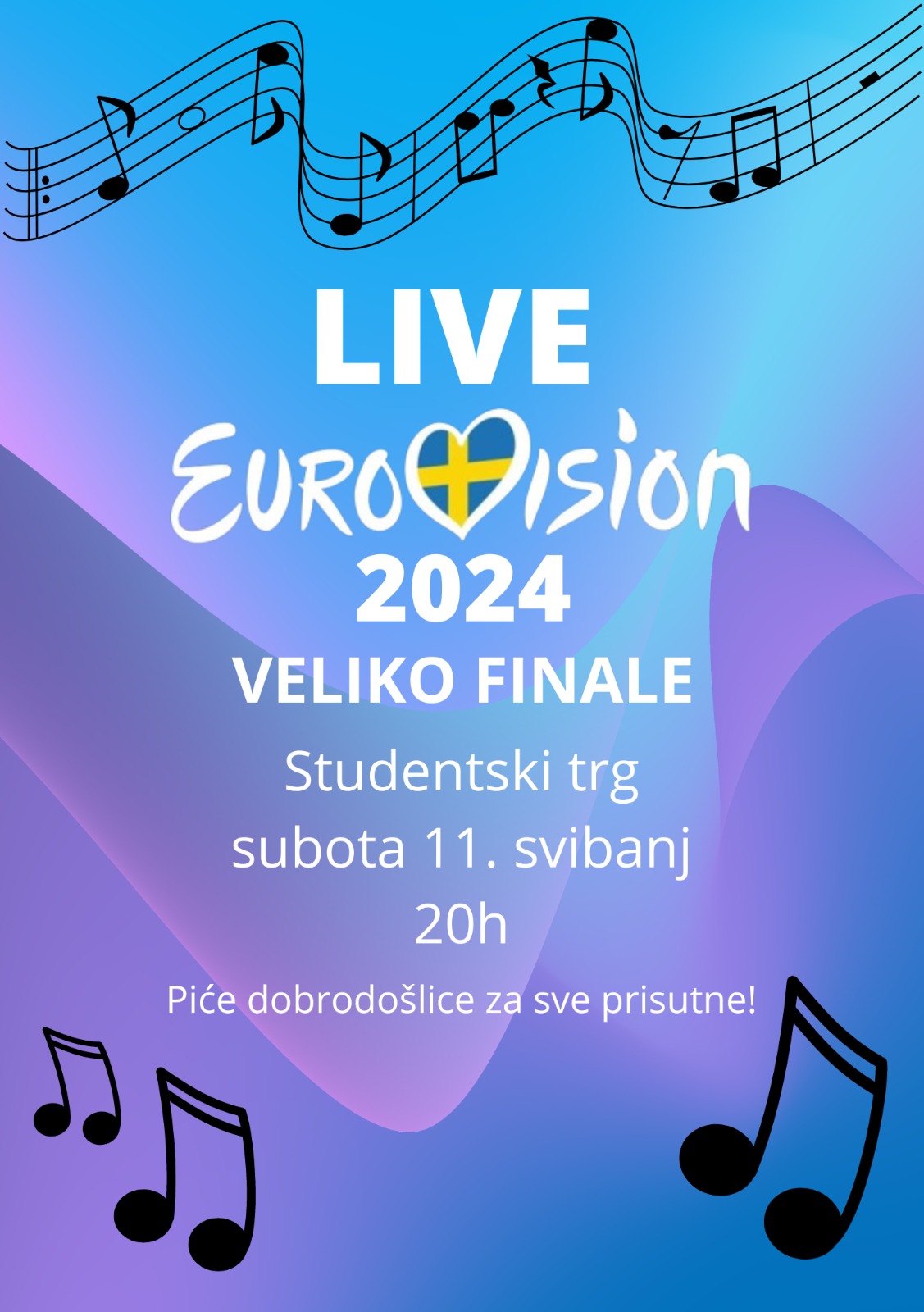 pozivamo vas u subotu 11. svibnja od 20h na Studentski trg da zajedno uživamo u live prijenosu velikog finala Eurosonga 2024! ????????