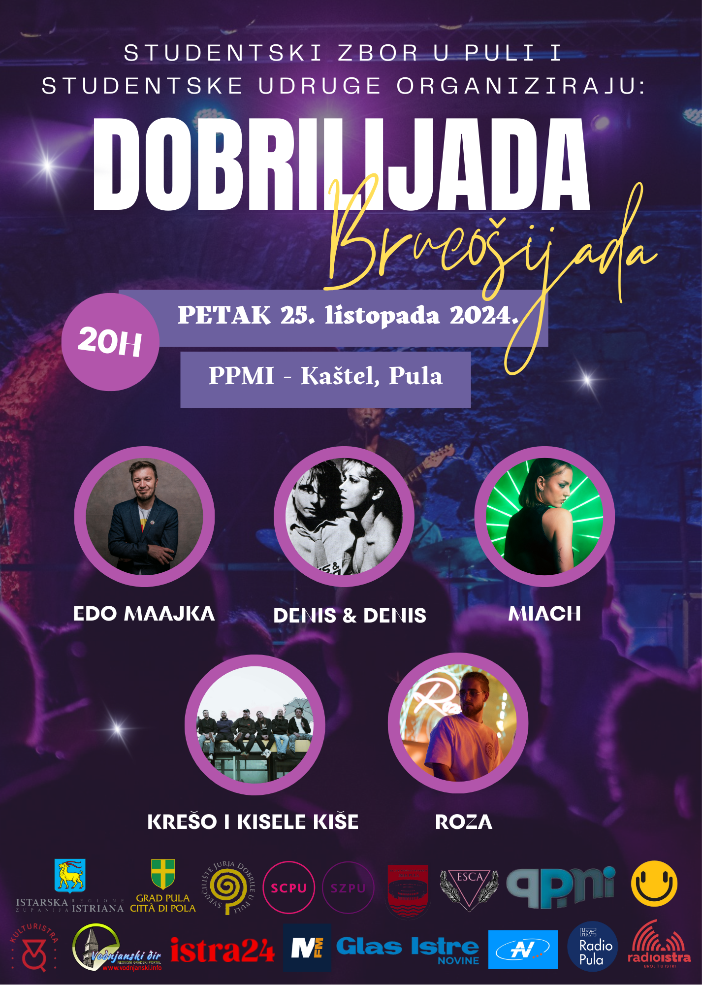 Ciljana grupa projekta su svi studenti i sveučilištarci Sveučilišta Jurja Dobrile u Puli s naglaskom na studente prvih godina svih studija. Ulaz će biti omogućen i ostaloj zainteresiranoj javnosti. Nastupaju vokalno-instrumentalni sastavi i DJ zabavne glazbe u rock, hip-hop, dance i r'n'b stilu: Krešo i kisele kiše (punkrock/Rijeka), Denis & Denis (electro-pop/Rijeka), Edo maajka (hip-hop/Zagreb), Miach (r'n'b/Zagreb), DJ Marin Roža (r'n'b/Rovinj). Studentski zbor u Puli će izdati ulaznice koje možete pribaviti uz donaciju koja će se u potpunosti utrošiti na uređivanje budućih prostorija za studente u Puli i na novom Kampusu u bivšoj Mornaričkoj bolnici.